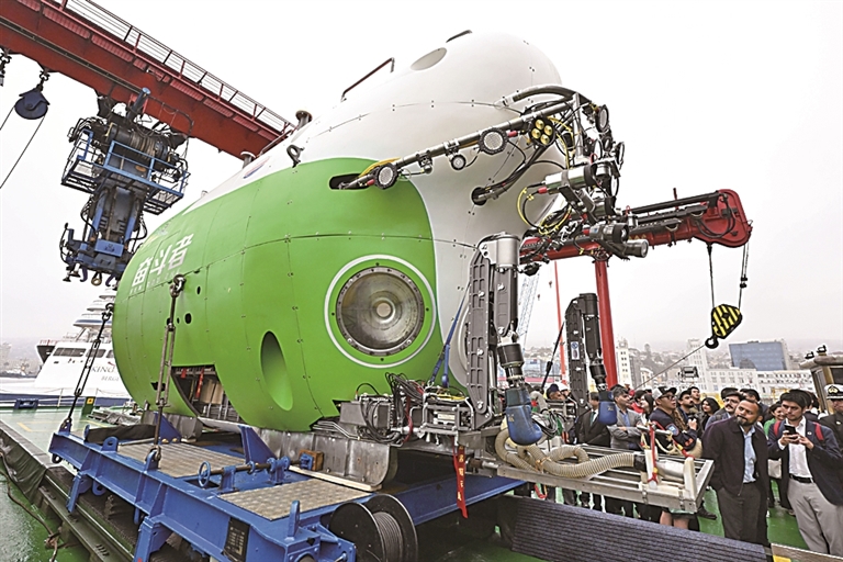 在靠岸于智利中部瓦尔帕莱索港的中国“探索一号”科考船上,东说念主们参不雅“激越者”号载东说念主潜水器。新华社发