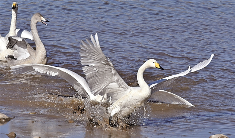 天鹅在北京密云水库流域的净水河中嬉戏。新华社发