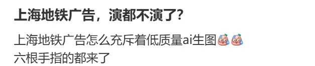 有网友发帖吐槽,上海地铁海报中,模特的手出现了六根手指,质疑告白画面使用AI生成。