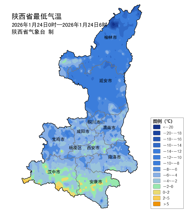具体区分:陕北-21~-1℃,最低神木圪丑沟站-21.4℃;关中-11~2℃,最低旬邑马栏金盆站-11.3℃,西安站-2.5℃;陕南-11~3℃,最低宁陕胭脂坝站-10.9℃。相较昨晨,陕北、关中、陕南东部最低气温多数高涨。
