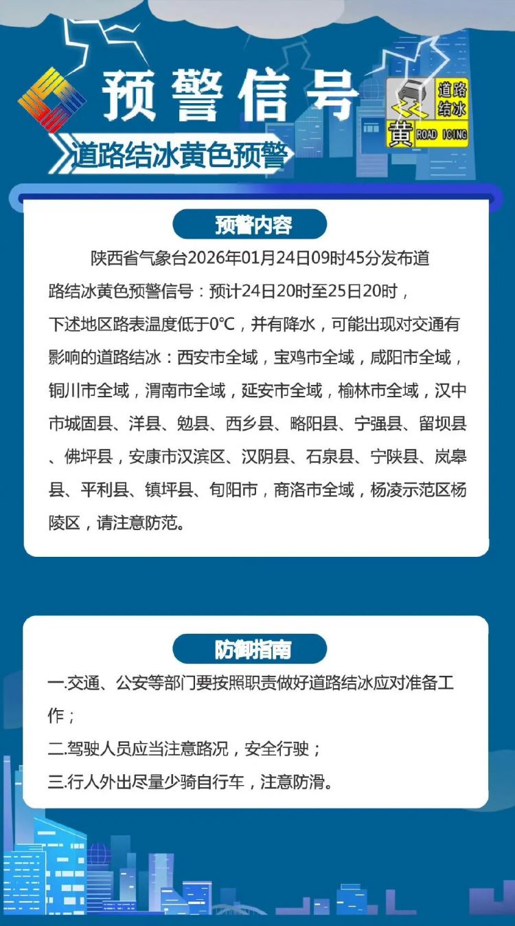 瞻望24日20时至25日20时,下述地区路表温度低于0℃,并有降水,可能出现对交通有影响的谈路结冰:西安市全域,宝鸡市全域,咸阳市全域,铜川市全域,渭南市全域,延安市全域,榆林市全域,汉中市城固县、洋县、勉县、西乡县、略阳县、宁强县、留坝县、佛坪县,安康市汉滨区、汉阴县、石泉县、宁陕县、岚皋县、平利县、镇坪县、旬阳市,商洛市全域,杨凌示范区杨陵区,请注释正经。