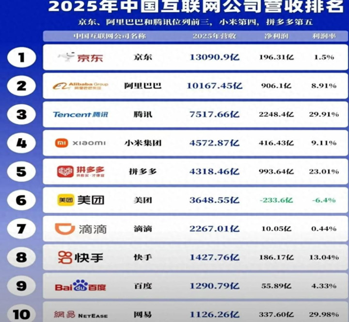 其中京东是收入最高的企业,其实亦然国内民企之首,2025年的收入高达1.3万亿元,排在第又名。可是京东的利润却不高,只消196.31亿元,利润率只消1.5%,果真不像一家互联网企业。