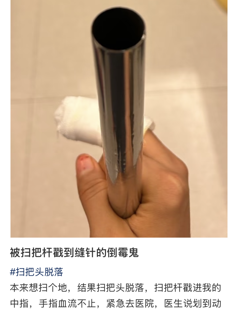 除了手指“伸进去,出不来”外,不少网友还共享了扫把头零散后,我方被扫把杆割伤、戳伤的阅历,看起来相配慌张。