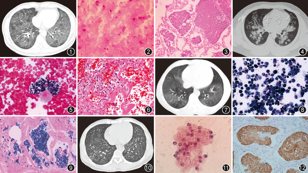 图1PAP患者胸部HRCT裸露双肺填塞性磨玻璃影,伴舆图征和铺路石征 图2PAP患者BALF涂片裸露多数嗜伊红性无定形物资 HE 中倍放大 图3PAP患者肺活检组织病理裸露肺泡腔内多数PAS染色阳性的无定形物资 PAS 中倍放大 图4DAH患者胸部HRCT裸露双肺填塞性磨玻璃影,呈肺腺泡样散播 图5DAH患者BALF涂片裸露多数红细胞及部分含铁血黄素细胞 HE 中倍放大 图6DAH患者肺活检组织病理裸露肺泡腔内多数红细胞及极少铁血黄素细胞 HE 中倍放大 图7IPH患者胸部HRCT裸露双肺填塞性磨玻璃影 图8IPH患者BALF涂片裸露多数含铁血黄素细胞 铁染色 中倍放大 图9IPH患者肺活检组织病理裸露肺泡腔内铁血黄素细胞 铁染色 中倍放大 图10PCP患者胸部HRCT裸露双肺填塞性磨玻璃影 图11PCP患者BALF涂片裸露多数肺孢子菌包囊 GMS+伊红复染,中倍放大 图12PCP患者肺组织病理裸露肺泡腔内泡沫样渗出物 ICH 中倍放大