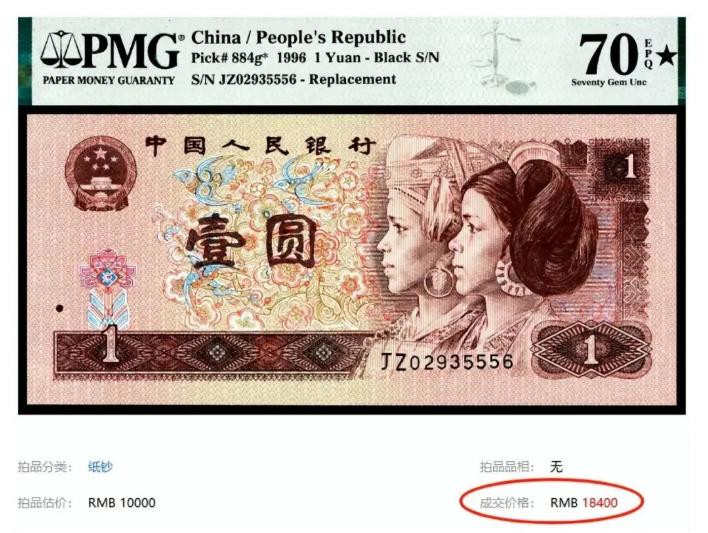 再说回那张卖了18400元的1元纸币。这亦然一张1996年的。它有两个特征,一个是70分的评级,也等于满分的评级,讲解这张纸币品相卓越的好。再加上它的冠号是JZ,这是属于961当中的补号冠纸币。这样的冠号刊行的数目有限,是以这张1元纸币梗概拍出这样高的价钱。
