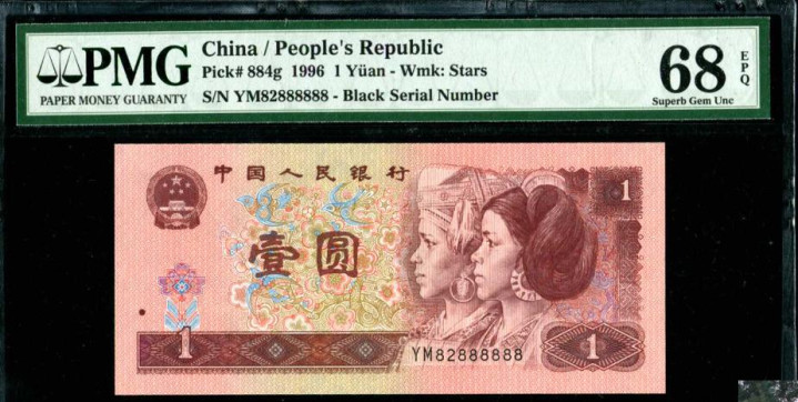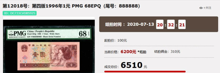 公共看上图,这是一张1996年的1元纸币,它是68分的评级币。这张纸币的拍卖价钱是6510元。能拍到这样高的价钱,最主要的原因等于因为它的活水号是888888,也等于六同八的大象号纸币。