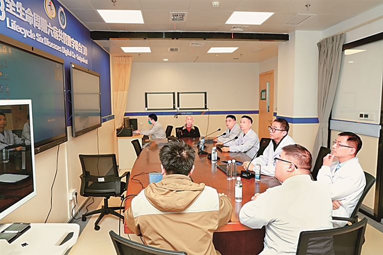 上海、三明两地医务东说念主员在三明市第一病院全生命周期六病共管数字长初学诊为病东说念主看诊。郑烨摄/光明图片