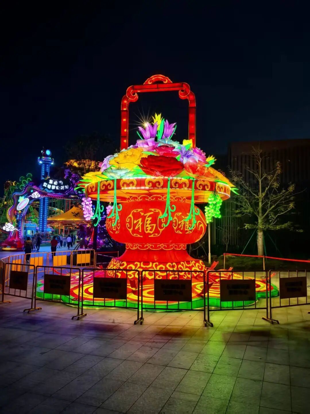 巨型狮头颜色绮丽,搭配两侧小狮,象征眷属兴旺、福分绵延;狮头下方“吉利如意”的红色卷轴,搭配周围的灯笼、炮竹、福袋等元素,全体寓意吉利喜庆、驱邪纳福。