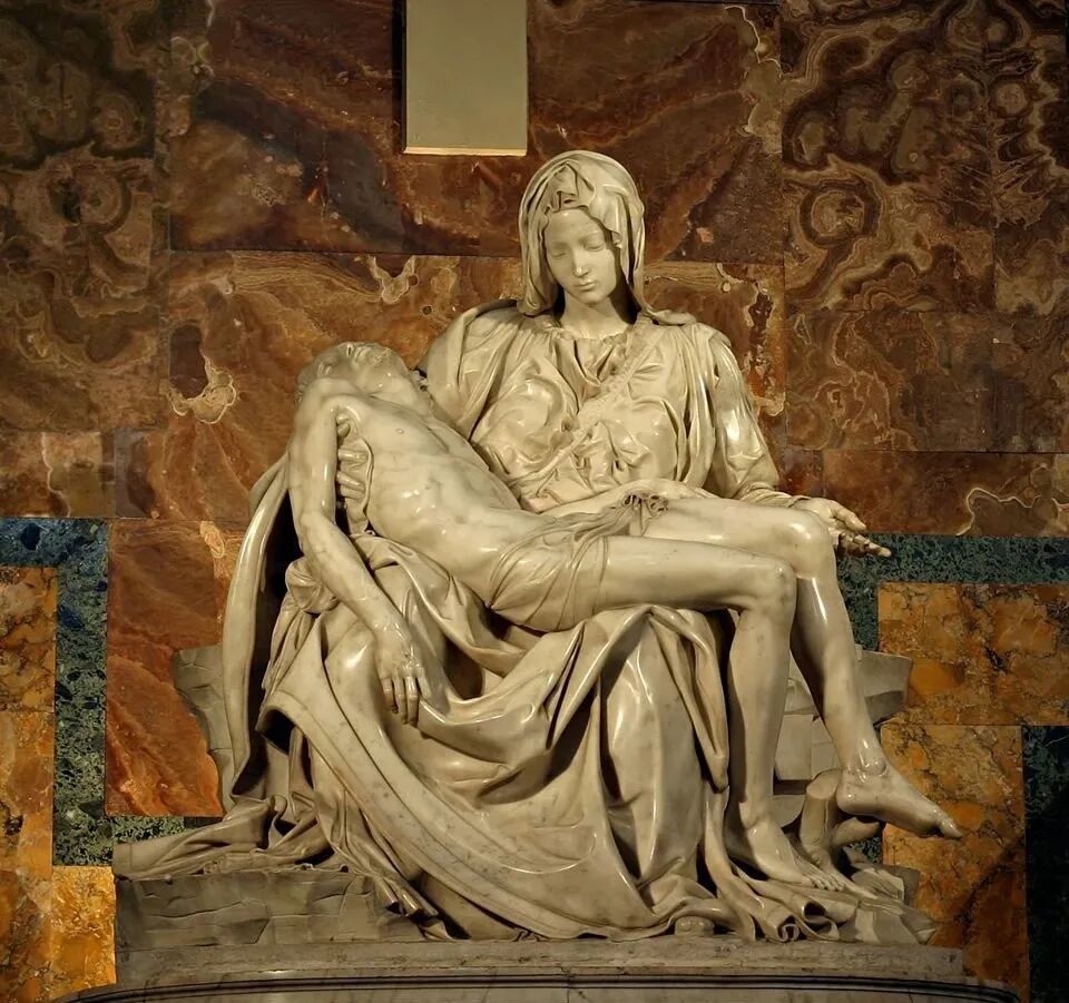 这个作品是依据《圣经》故事,确认基督从十字架上被卸下来后,圣母玛丽娅抱起犬子尸体时哀悼与诅咒的景象。圣母被形容成为一个姿色在意秀逸的青娥,却莫得影响到确认她对基督之死的哀悼,她的好意思是直不雅的,但她的悲哀却是深千里的。她所体现出的芳华、长久和长久的好意思,恰是东说念主类对好意思追求的最高梦想。
