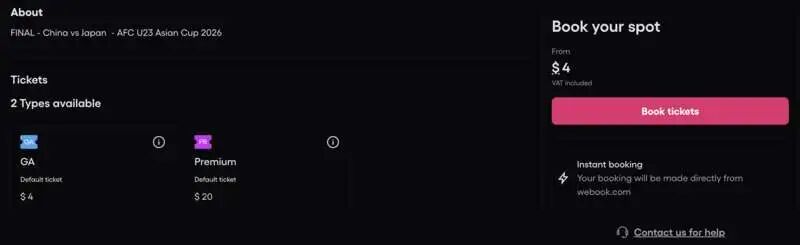 在官方票务平台Webook上,U23亚洲杯中日决赛的门票平素票为4好意思元(约28元东说念主民币),高档门票为20好意思元(约140元东说念主民币)。