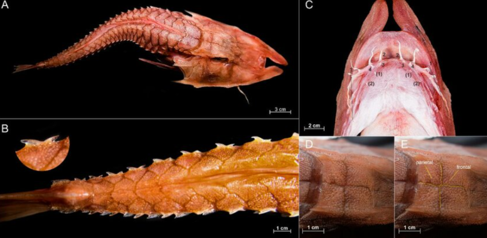 其头部被坚忍的骨板王人备消亡,鳃盖角落与头顶棱脊处还特地枚热烈的锯齿状棘刺横向伸出;眼睛贼大,吻部上前隆起,前端分叉,酿成独到的外不雅,我都不知说念咋形色这个吻部了,下颌还长有触须;其胸鳍浩繁如扇;鱼体比拟头部要纤细许多,消亡着坚忍的骨板状栉鳞,角落还有尖棘;尾鳍截形。