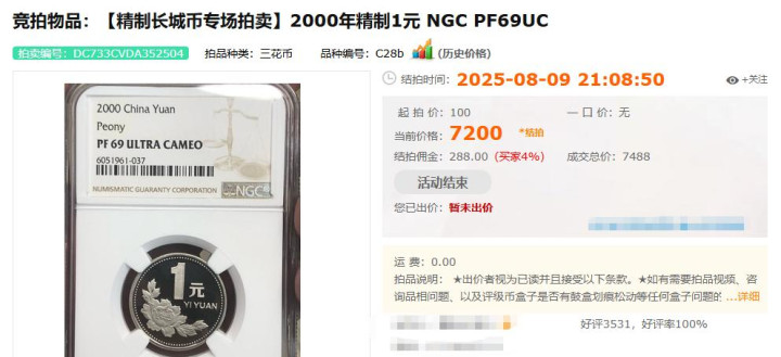 再来看一下2000年的牡丹1元硬币精制币。这枚硬币的评分更高,达到了69分的评级。它在2025年的8月份卖出了7488元的高价。