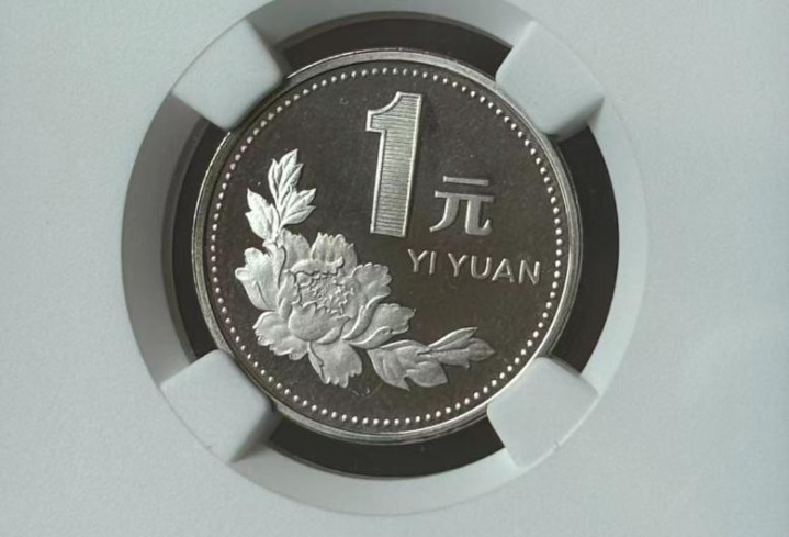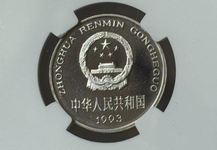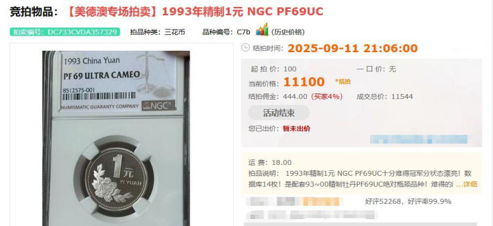 上头这枚是1993年的牡丹1元硬币精制币。这枚硬币在2025年的9月卖出了11544元的高价。它是一枚69分的评级币,是十分贫苦的冠军分,是以价钱才会有高潮这样多。