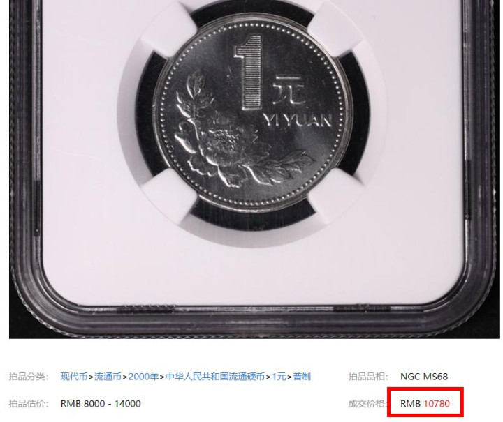 各人看上图,这是一枚2000年的牡丹1元硬币,普质币。它的评级是68分,一经算是很高了。这枚硬币就拍出了10780元的高价。