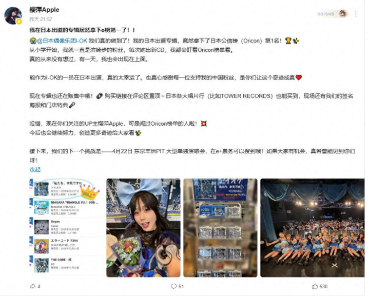 她行为I-OK成员参与的日本出谈专辑,告成登上了Oricon榜单第一。