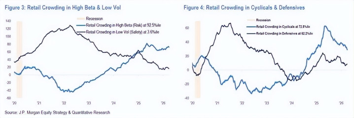 有关词近期该举止出现了历史性的逆转:散户对短期动量品种的拥堵进度初次独特对落伍方向的拥堵进度。这意味着散户面前仍抓有高贝塔钞票(拥堵进度处于第92.5百分位,与短期动量高度吻合),而不再为低波动(即面前的滞后品种)补仓。与此同期,散户还在抓续削减周期性钞票敞口。
