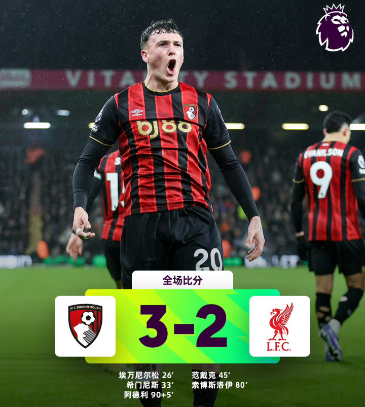 英超:伯恩茅斯3-2利物浦 补时绝杀!范戴克罪行+破门