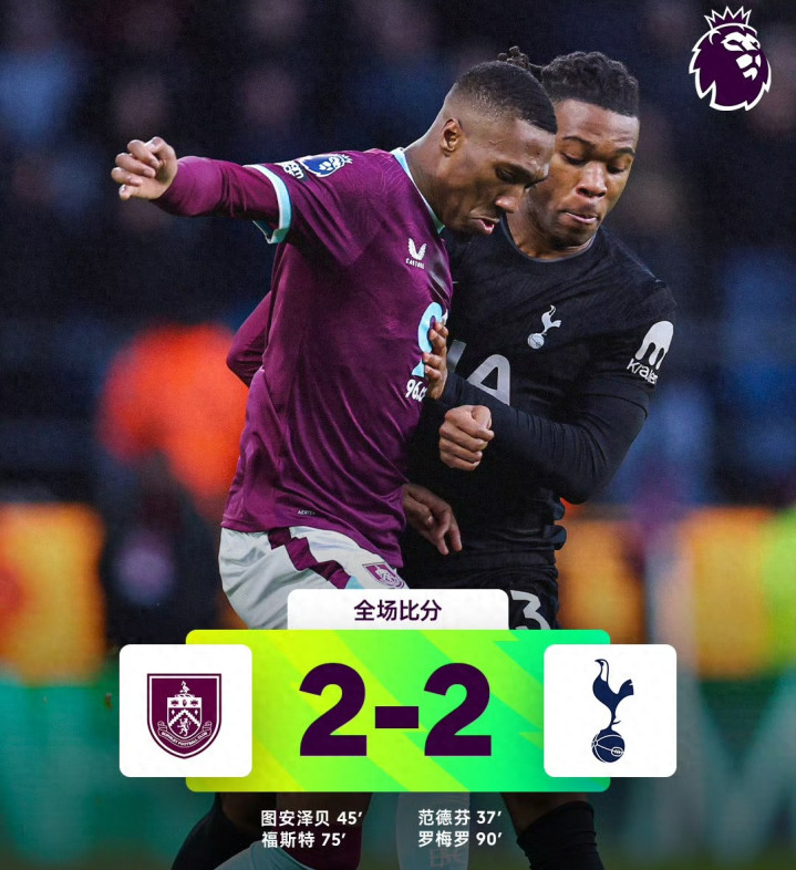 英超:伯恩利2-2热刺 罗梅罗90分钟绝平 热刺5轮不堪