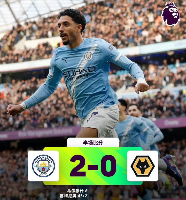 主场作战的曼城开场就掌控节拍。第7分钟,曼城迎来虚幻开局,努内斯送出助攻,马尔穆什中路抢戳破门,曼城1-0当先狼队。