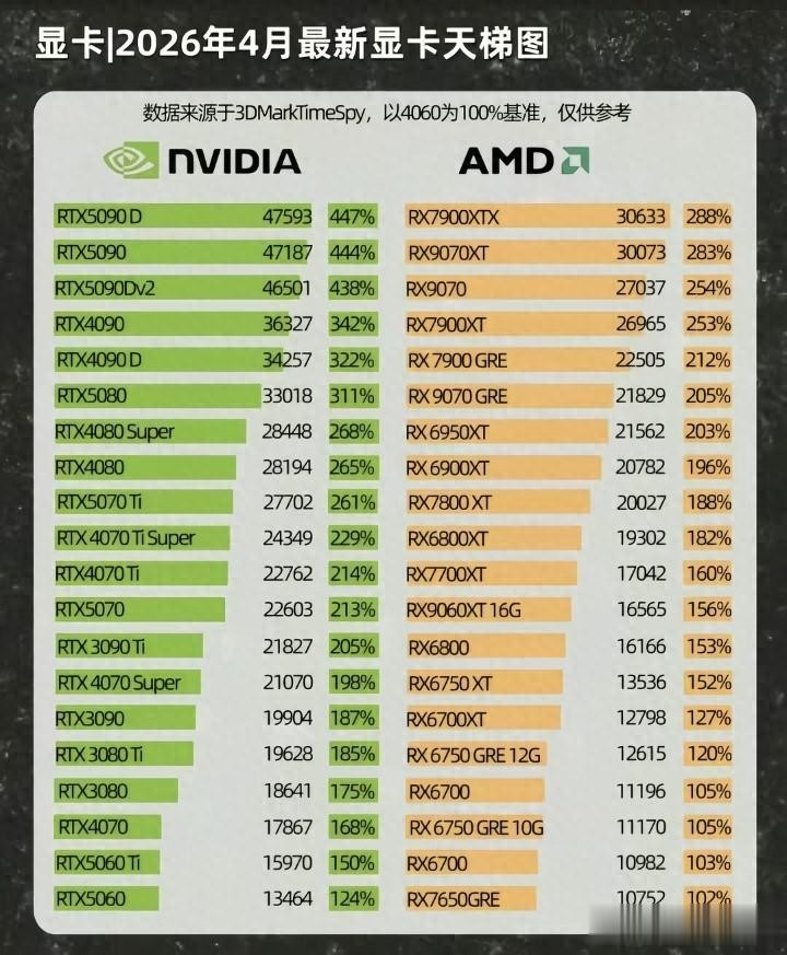 2026年4月,显卡商场迎来新一轮性能模式重塑。凭证3DMark Time Spy的测试数据,以RTX 4060为100%基准,NVIDIA与AMD两大阵营的旗舰及主流显卡性能排名矜重出炉,这场硬件竞赛不仅反馈了技能迭代的遵守,更揭示了销耗者在性能、功耗与价钱间的衡量弃取。