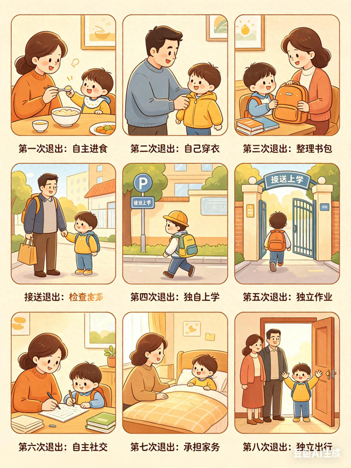 这8次退出,不是一天完成的。孩子几岁,你就退到几岁该有的形式。你退一步,他进一步。你舍不得退,他就恒久长不大。