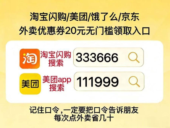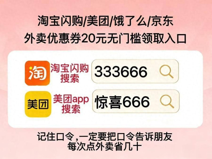 淘宝闪购搜【333666】好意思团 APP搜【惊喜666】天天领外卖红包。好意思团外卖神券口令最新领取进口好意思团 APP搜【惊喜666】。