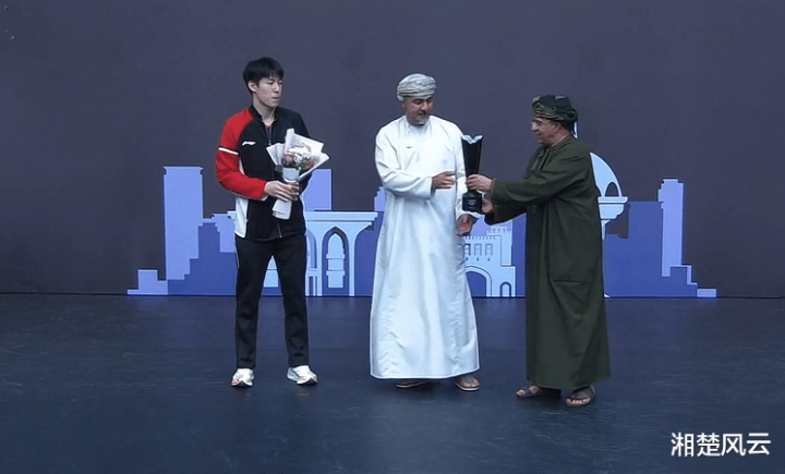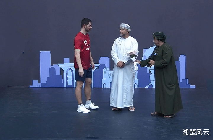 取得男单亚军的弗朗西斯卡领先登台领奖。他上台后,与受奖嘉宾聊了起来。他不愧是乒坛宿将,有一定的知名度,受奖嘉宾也尊重他。
